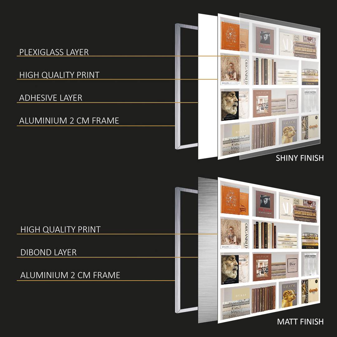 Plexiglass (acrylic glass) offers a high-definition finish that enhances color vibrancy and depth, creating a sleek, modern look, making it ideal for well-lit spaces where brilliance is desired. The surface reflects light beautifully, giving it a gl...