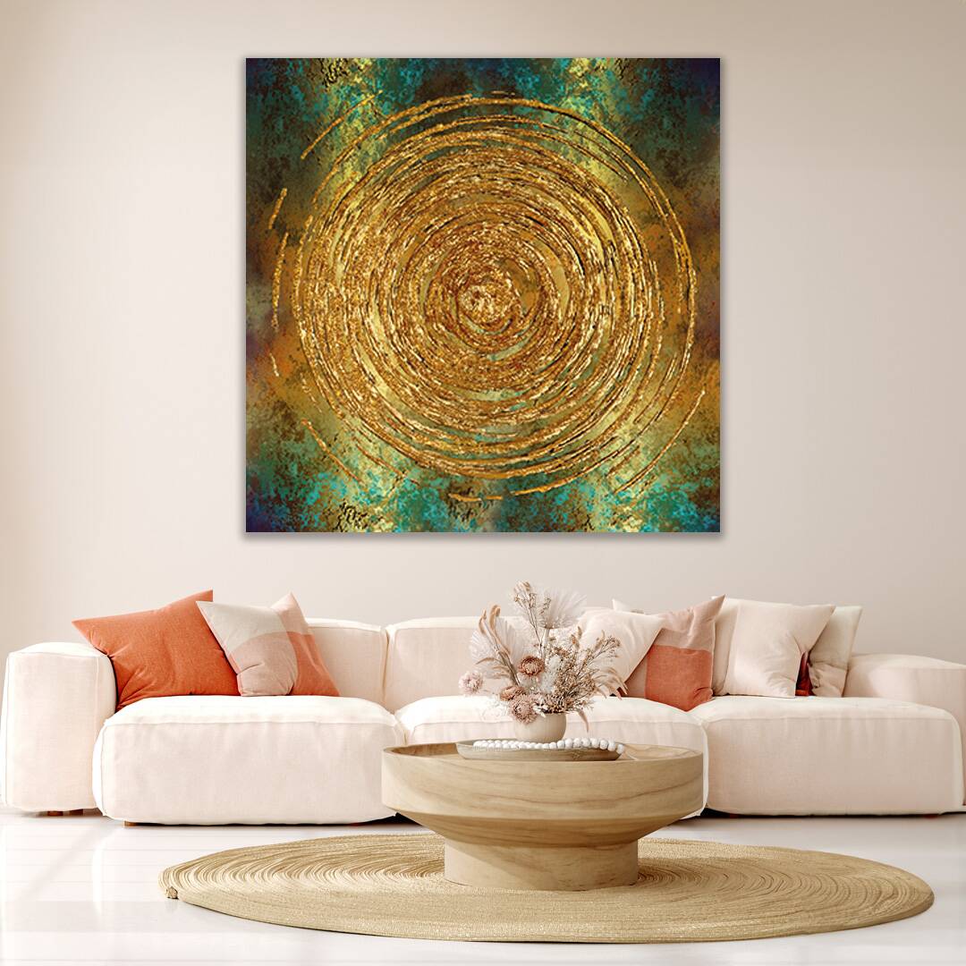 My Golden Years by artist Harley is a mesmerizing abstract composition that radiates elegance, depth, and timeless energy. Featuring concentric golden textures set against a backdrop of rich emerald, teal, and earthy tones, this artwork captures the balance between harmony and transformation. The circular motif symbolizes life’s cycles, continuity, and enlightenment, while the shimmering gold evokes prosperity, wisdom, and inner strength.